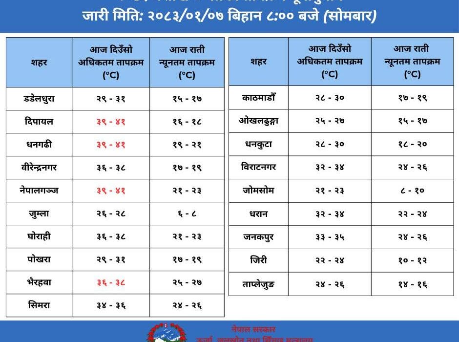 आज दिउँसोको अधिकतम तापक्रम हेर्दा दिपायल, धनगढी र नेपालगन्ज सबैभन्दा तातो हुने अनुमान गरिएको छ । यी सहरहरूको तापक्रम ३९ देखि ४१ डिग्री सेल्सियस सम्म पुग्न सक्ने देखिएको छ । यस्तै, भैरहवा र वीरेन्द्रनगरमा ३६ देखि ३८ डिग्री र सिमरामा ३४ देखि ३६ डिग्री सेल्सियस तापक्रम रहने प्रक्षेपण गरिएको छ ।