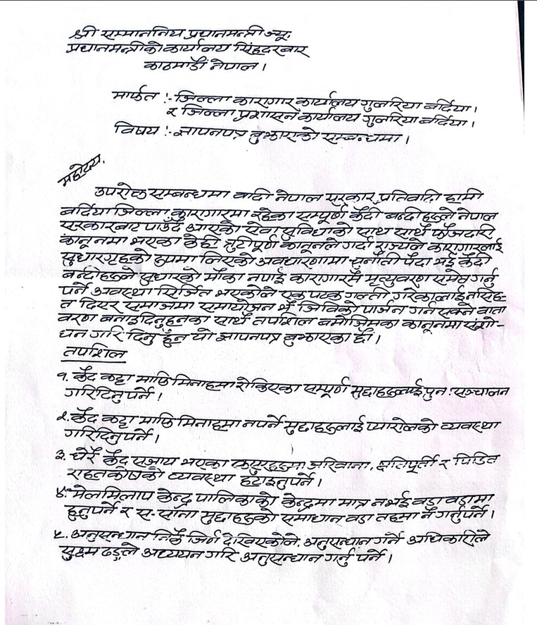 बर्दिया । बर्दिया जिल्ला कारागारमा रहेका कैदीबन्दीहरूले विभिन्न कानुनी तथा नीतिगत सुधारको माग गर्दै प्रधानमन्त्रीसमक्ष १५ बुँदे ज्ञापनपत्र पेश गरेका छन् ।