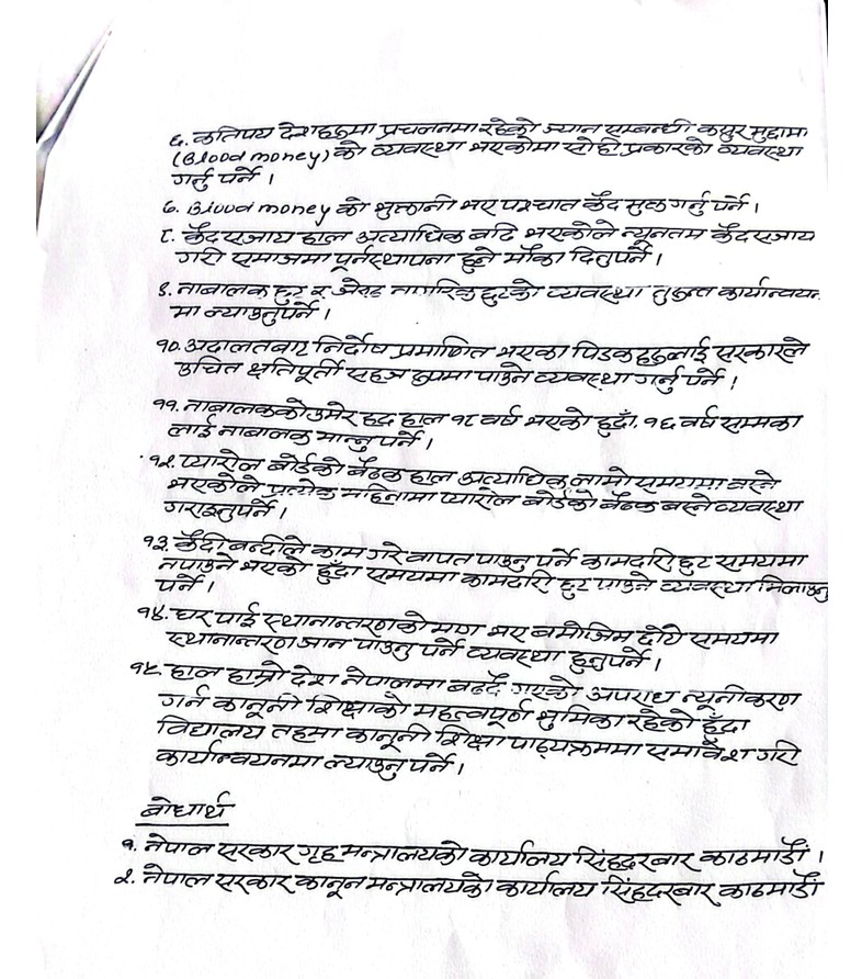 ज्ञापनपत्रमा माफी मिनाहा प्रक्रिया पुनः सञ्चालन गर्नुपर्ने, प्यारोलको व्यवस्था लागू गर्नुपर्ने, अत्यधिक सजाय तथा जरिवानामा पुनर्विचार गर्नुपर्ने लगायतका मागहरू समावेश छन्। साथै, मेलमिलाप केन्द्र वडा तहसम्म विस्तार गर्नुपर्ने, अनुसन्धान प्रक्रियालाई सुदृढ बनाउनुपर्ने, र कैद सजाय न्यूनतम बनाउनुपर्ने माग पनि गरिएको छ।