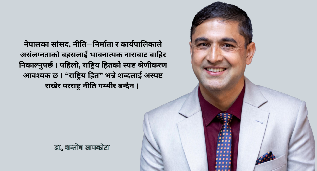 यही कारणले नेपालका सांसद, नीति–निर्माता र कार्यपालिकाले असंलग्नताको बहसलाई भावनात्मक नाराबाट बाहिर निकाल्नुपर्छ । पहिलो, राष्ट्रिय हितको स्पष्ट श्रेणीकरण आवश्यक छ । “राष्ट्रिय हित” भन्ने शब्दलाई अस्पष्ट राखेर परराष्ट्र नीति गम्भीर बन्दैन । सीमा सुरक्षा, पारवहन सुरक्षा, ऊर्जा निर्यात, श्रमिक संरक्षण, आपूर्ति स्थिरता, साइबर सुरक्षा, खाद्य तथा इन्धन लचिलोपन, प्रविधि पहुँच र गुणस्तरीय विदेशी लगानीलाई परराष्ट्र नीतिको स्पष्ट प्राथमिकता बनाउनुपर्छ । दोस्रो, परराष्ट्र मन्त्रालयलाई वास्तवमै “लिड मन्त्रालय” बनाउने हो भने त्यसले अर्थ, ऊर्जा, गृह, श्रम, उद्योग–वाणिज्य, पर्यटन, सूचना प्रविधि र सुरक्षा निकायबीच नीति–समन्वय गर्ने क्षमता विकास गर्नुपर्छ । केवल अन्तर्राष्ट्रिय मञ्चमा “नेपालको परराष्ट्र नीति असंलग्नतामा आधारित छ” भनेर दोहोर्याउनु पर्याप्त छैन । तेस्रो, परराष्ट्र सेवामा रहेका कूटनीतिज्ञ, विश्लेषक र कर्मचारीलाई राष्ट्रिय सुरक्षा, आर्थिक कूटनीति, क्षेत्रीय शक्ति–राजनीति, जलविद्युत् व्यापार, प्रविधि शासन र संकट कूटनीतिबारे व्यवस्थित रूपमा पुनःप्रशिक्षित गर्नुपर्छ । नेपालको आधिकारिक परराष्ट्र नीति दस्तावेजले आर्थिक समृद्धि र राष्ट्रिय गौरवलाई परराष्ट्र नीतिको केन्द्रमा राखेको छ; अब त्यसलाई संस्थागत व्यवहारमा रूपान्तरण गर्नुपर्ने समय हो ।