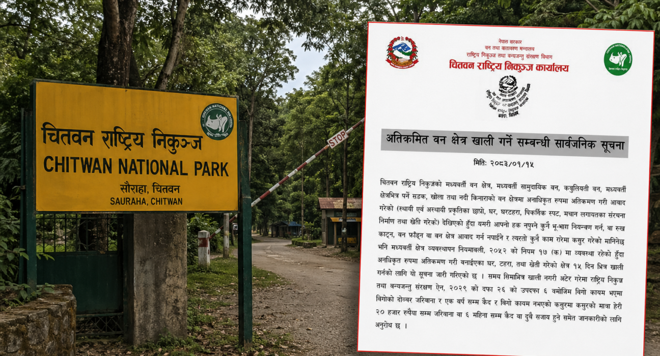 काठमाडौं । चितवन राष्ट्रिय निकुञ्ज कार्यालयले निकुञ्ज तथा मध्यवर्ती क्षेत्रभित्र भएका अतिक्रमण हटाउन सार्वजनिक सूचना जारी गरेको छ । कार्यालयले वन क्षेत्र, सामुदायिक वन, कुन्जभित्रका सडक, खोला तथा नदी किनारका क्षेत्रमा अनाधिकृत रूपमा बसोबास तथा संरचना निर्माण गरिएको भन्दै त्यसलाई तत्काल हटाउन निर्देशन दिएको हो ।