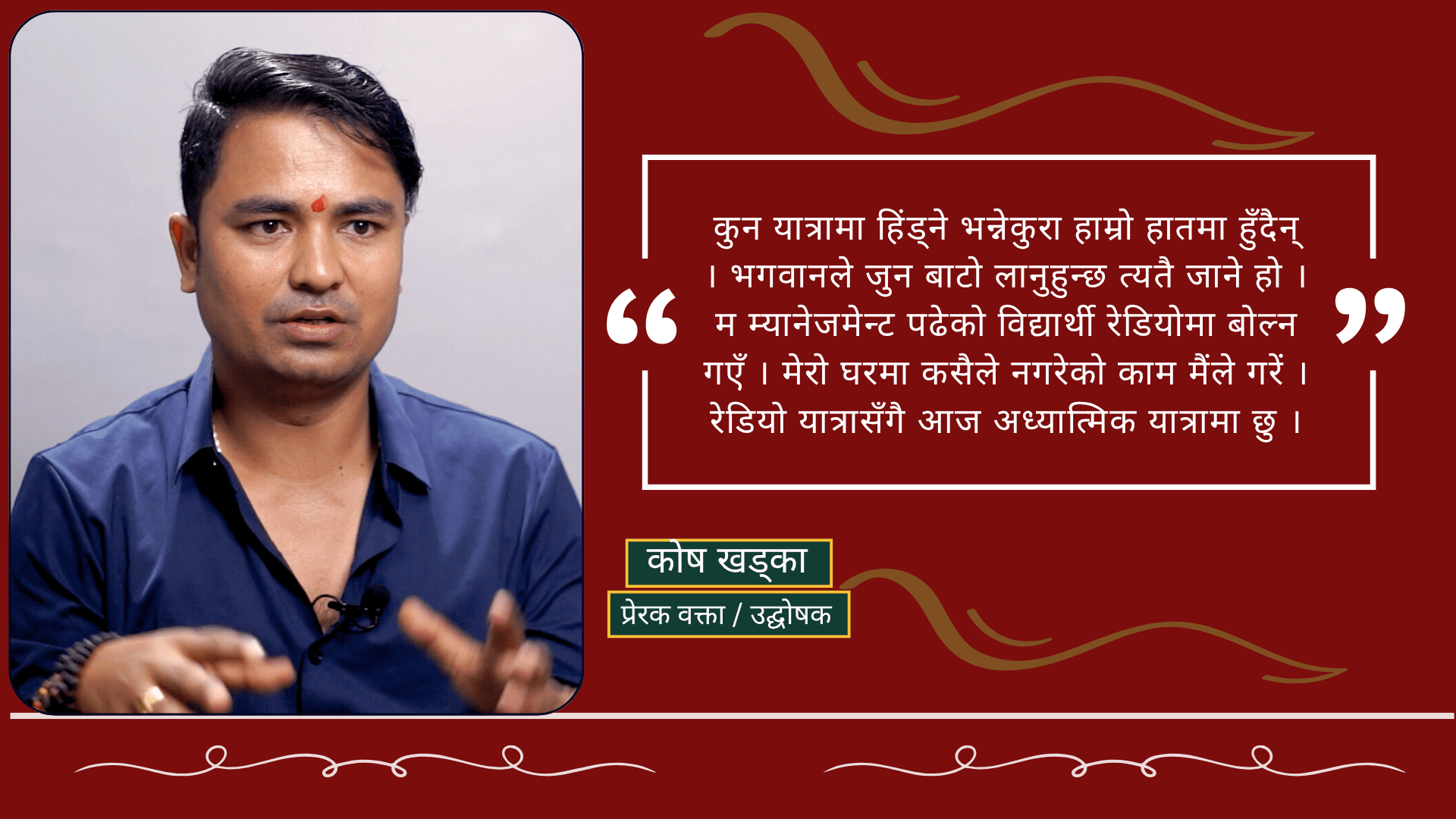 बागमती मुख्य समाचार विचार समाचार समाज रेडियोबाट स्टेज पुगेका कोष खड्का : जो प्रभावशाली कथा बाचक... कोष खड्का(भारद्धाज) व्यस्त रेडियोकर्मी होइनन् तर जादूमयी प्रश्तुतीले चर्चित बनेका व्यस्त उद्घोषक हुन् । अब उनी उद्घोषक मात्र होइन प्रेरणादायी... BY नेपाल न्युज बैंक ३ महिना अघि 0 Comments