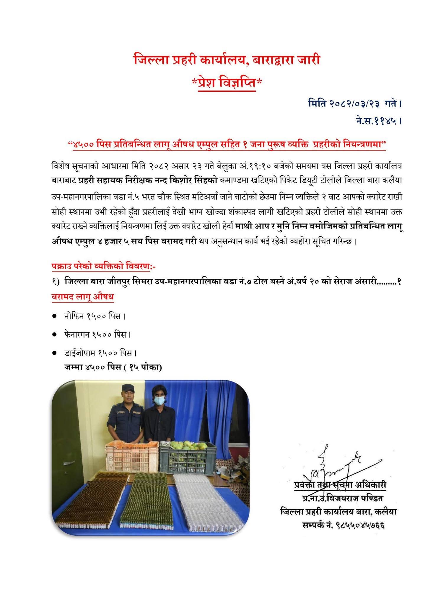 मुख्य समाचार विचार समाचार समाज ४ हजार ५ सय पिस एम्पुल सहित अन्सारी पक्राउ रौतहट । बारा प्रहरीले प्रतिवन्धित लागुऔषध एम्पुल सहित एक जनालाई पक्राउ गरेको छ । ४ हजार ५ सय पिस... BY नेपाल न्युज बैंक ३ महिना अघि 0 Comments