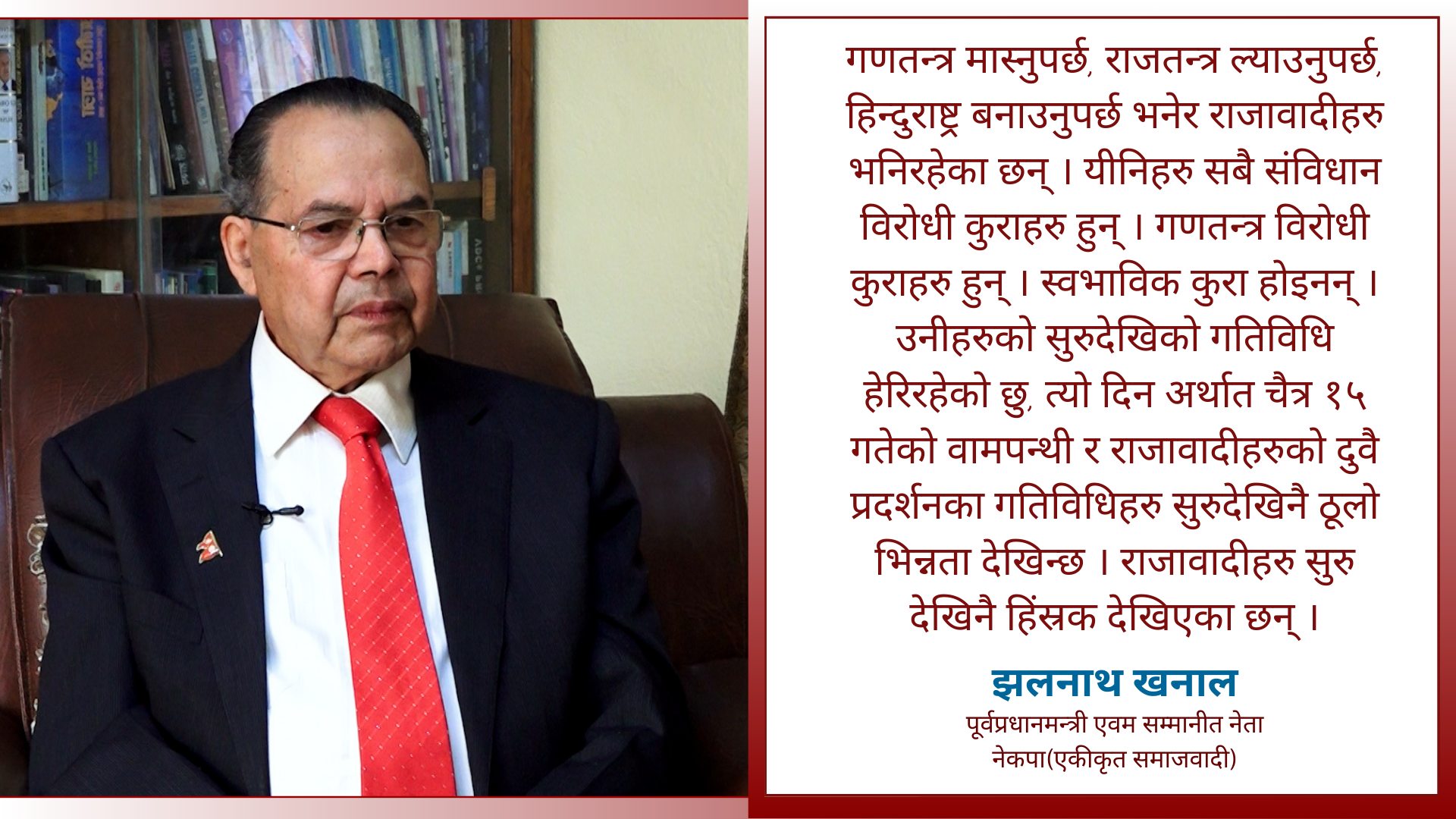गणतन्त्र मास्नुपर्छ, राजतन्त्र ल्याउनुपर्छ, हिन्दुराष्ट्र बनाउनुपर्छ भनेर राजावादीहरु भनिरहेका छन् । यीनिहरु सबै संविधान विरोधी कुराहरु हुन् । गणतन्त्र विरोधी...