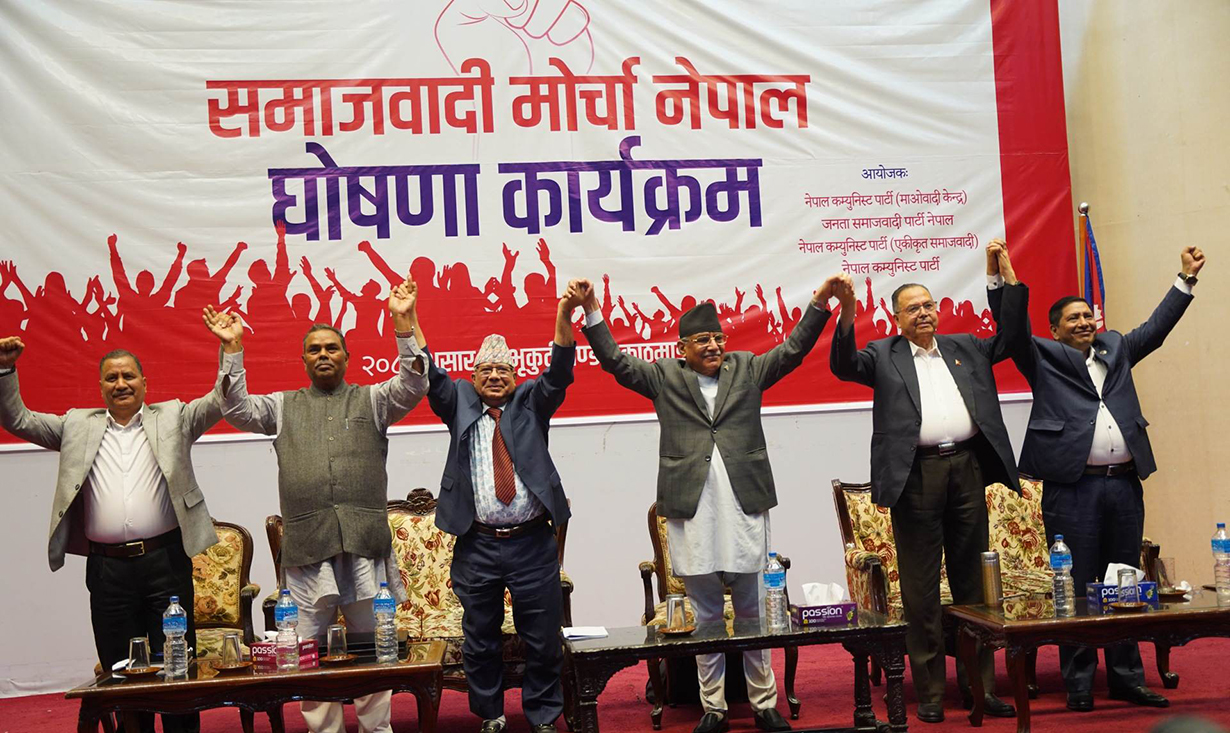 बैंक–वित्त चार दलले घोषणा गरे समाजवादी मोर्चा ४ असार, काठमाडौं । सरकारको नेतृत्वकर्ता माओवादी केन्द्रसहित चार दलले समाजवादी मोर्चा घोषणा गरेका छन् । राष्ट्रियसभा गृहमा आयोजित कार्यक्रममा... BY News and Updates 0 Comments