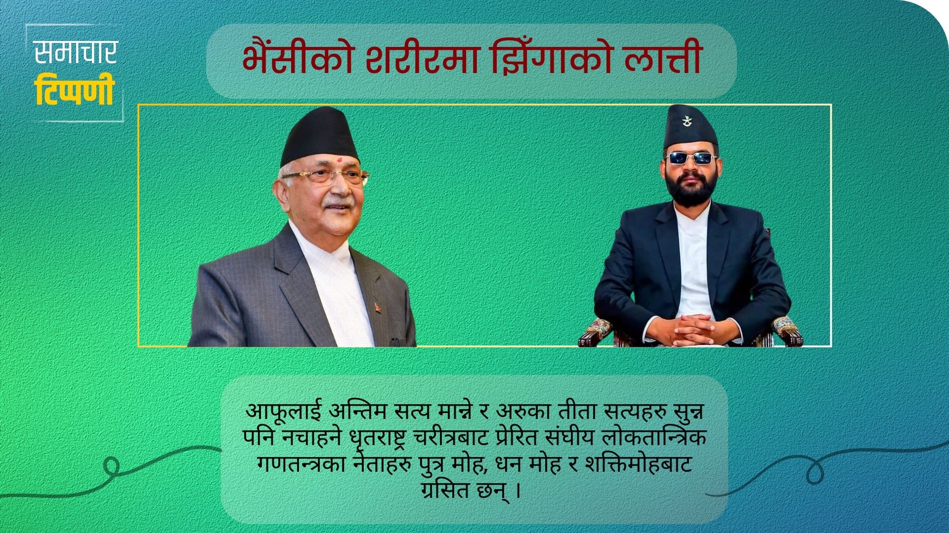 मुख्य समाचार समाचार टिप्पणी : भैंसीको शरीरमा झिँगाको लात्ती २९ जेठ , काठमाडौं । महात्मा विदुरले हजार पल्ट सम्झाए पनि धृतराष्ट्रले कहिल्यै सुनेनन् । कटुसत्य बोल्थे विदुर आफ्ना महाराजको... BY रातो कागज 0 Comments