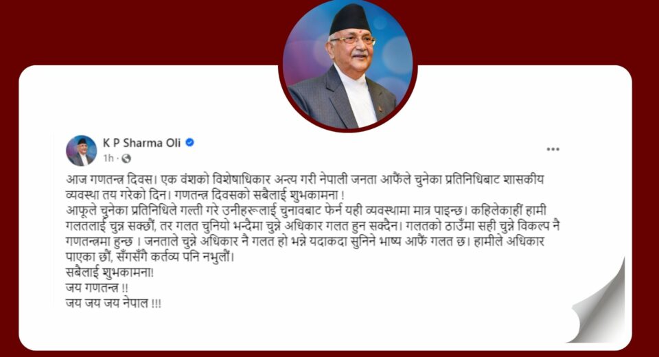 १५ जेठ , काठमाडौं । नेकपा एमालेका अध्यक्ष केपी शर्मा ओलीले आफूले मतदान गरेर निर्वाचित गरेको जनप्रतिनिधिले गल्ती ग¥यो भने चुनावबाट फेर्न सकिने यही व्यवस्थामा मात्रै भएको बताएका छन् । मंगलबार १७ औँ गणतन्त्र दिवसको सन्दर्भमा अध्यक्ष ओलीले शुभकामना सन्देश दिँदै गलतको ठाउँमा सही चुन्ने विकल्प नै गणतन्त्र भएको बताएका छन् । ‘आजको दिन एक […]