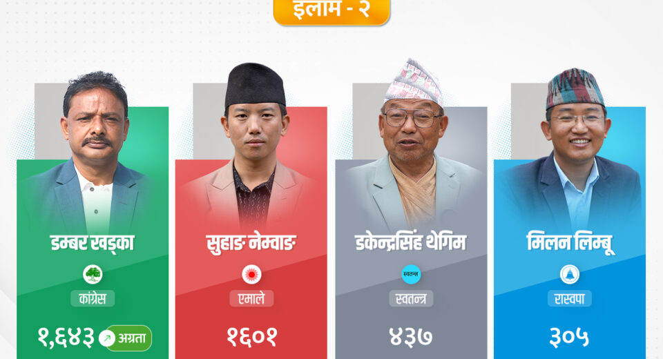 १६ वैशाख, इलाम । इलाम-२ को उपनिर्वाचनको मतगणनामा नेकपा एमालेका उम्मेदवार सुहाङ नेम्वाङले मतान्तर घटाएका छन् । फाकफोकथुम गाउँपालिका १, २, र ३ वडाको मतगणना गर्दा सुहाङले कांग्रेसका उम्मेदवार डम्बर खड्कासँग ४२ भोटको मतान्तर घटाएका हुन् । ४ हजार १ सय ८१ मत गणना हुँदा एमालेका उम्मेदवार सुहाङले १ हजार ६०१ मत पाएका छन् भने […]