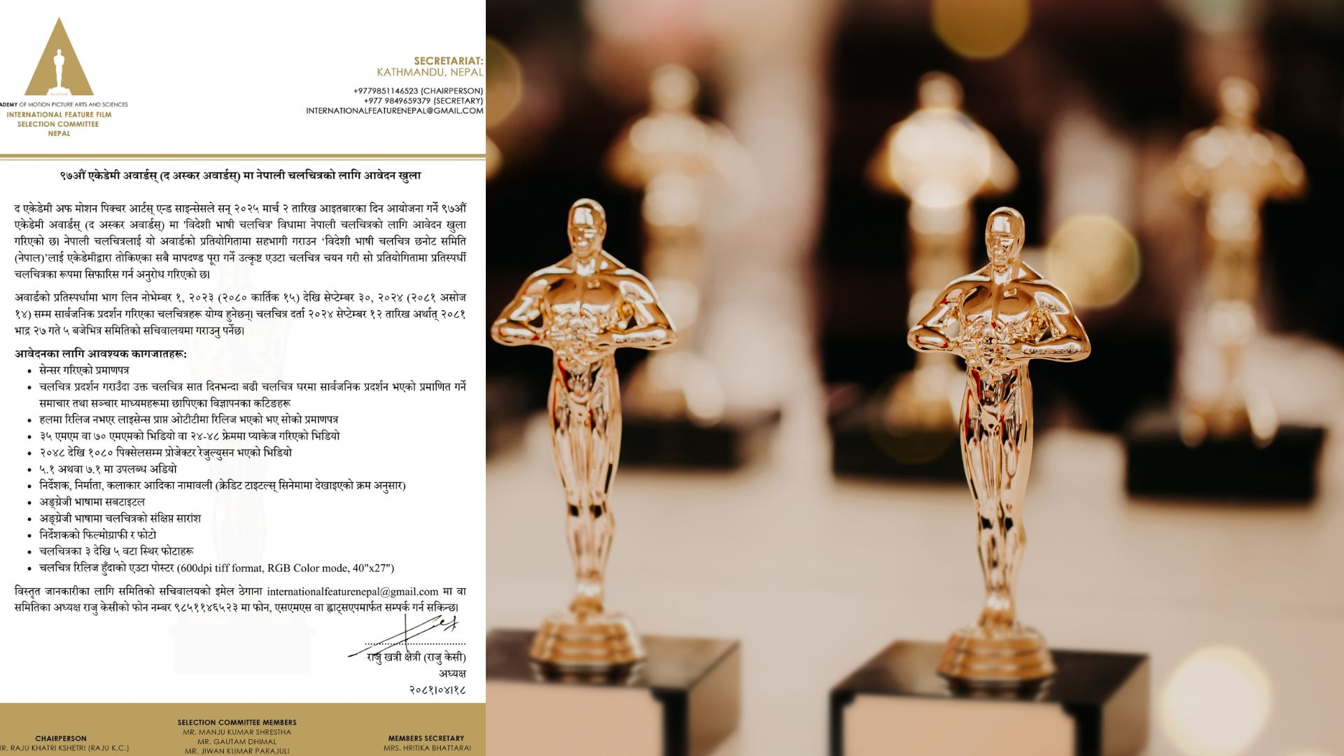 मनोरन्जन मुख्य समाचार समाचार द अस्कर अवार्डसमा नेपाली चलचित्रको लागि आवेदन खुला रातो कागज १८ साउन, काठमाडौं । द एकेडेमी अफ मोशन पिक्चर आर्टस् एन्ड साइन्सेस्ले ९७औँ एकेडेमी अवार्डस् (द अस्कर अवार्डस्) मा ‘विदेशी...