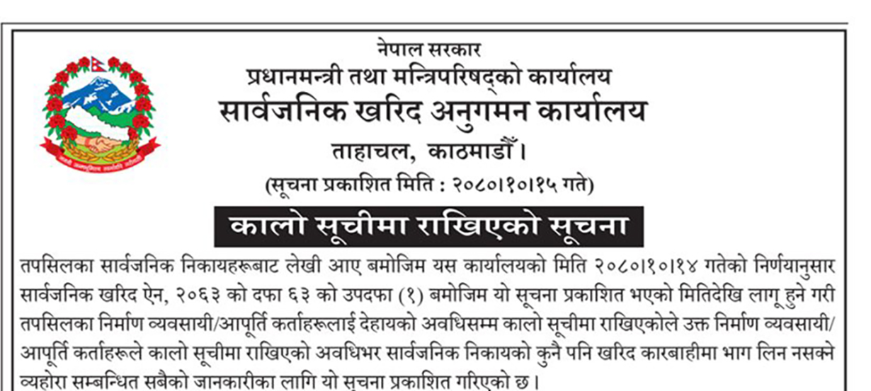 अर्थ मुख्य समाचार समाचार समाज सरकारको कालोसूचीमा परे २२ कम्पनी १५ माघ, काठमाडौं । प्रधानमन्त्री तथा मन्त्रिपरिषद्को कार्यालय अन्तर्गतको सार्वजनिक खरिद अनुगमन कार्यालयले कार्यसम्पादन राम्रो नभएका २२ निर्माण व्यवसायीहरुलाई कालोसूचीमा... BY रातो कागज 0 Comment