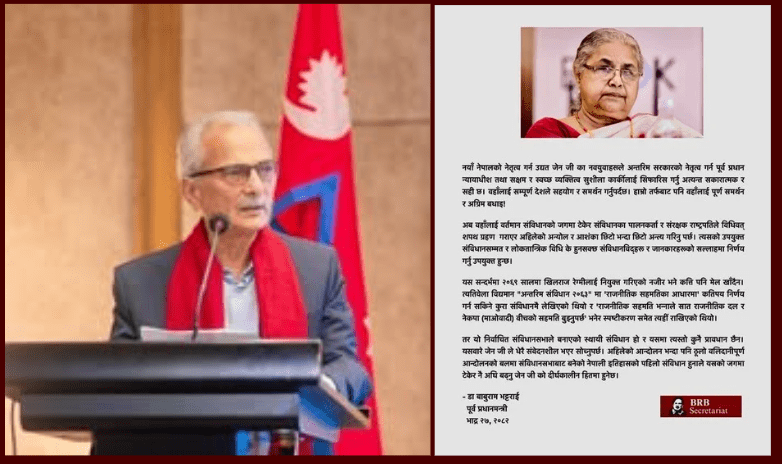 काठमाडौं । पूर्वप्रधानमन्त्री डा.बाबुराम भट्टराईले अन्तरिम सरकारको नेतृत्वमा पूर्वप्रधानन्यायाधीश सुशीला कार्कीलाई समर्थन गरेका छन् । शुक्रबार सामाजिक सञ्जालमा कार्कीको फोटोसहितको वक्तव्य जारी गर्दै भट्टराईले कार्की सक्षम र स्वच्छ व्यक्तित्व भएको बताए । कार्कीले वर्तमान संविधानको जगमा टेकेर संविधानका पालनकर्ता र संरक्षक राष्ट्रपतिले विधिवत् शपथ ग्रहण गराएर अहिलेको अन्योल र आशंका अन्त्य गर्नुपर्नेमा भट्टराईले जोड दिएका छन् । ‘नयाँ नेपालको नेतृत्व गर्न उद्यत जेन–जीका नवयुवाहरूले अन्तरिम सरकारको नेतृत्व गर्न पूर्वप्रधानन्यायाधीश तथा सक्षम र स्वच्छ व्यक्तित्व सुशीला कार्कीलाई सिफारिस गर्नु अत्यन्त सकारात्मक र सही छ । वहाँलाई सम्पूर्ण देशले सहयोग र समर्थन गर्नुपर्दछ । हाम्रो तर्फबाट पनि वहाँ गई पूर्णसमर्थन र अग्रिम बधाई, उनले अगाडि लेखेका छन्,‘अब वहाँलाई वर्तमान संविधानको जगमा टेकेर संविधानका पालनकर्ता र संरक्षक राष्ट्रपतिले विधिवत् शपथ ग्रहण गराएर अहिलेको अन्योल र आशंका छिटो भन्दा छिटो अन्त्य गरिनु पर्छ । त्यसको उपयुक्त संविधानसम्मत र लोकतान्त्रिक विधि के हुनसक्छ संविधानविद्हरू र जानकारहरूको सल्लाहमा निर्णय गर्नु उपयुक्त हुन्छ ।’ त्यस्तै डा. भट्टराईले ०६९ सालमा खिलराज रेग्मीलाई नियुक्त गरिएको नजीर भने कति पनि मेल नखाने जिकिर गरे । ‘त्यतिवेला विद्यमान ‘अन्तरिम संविधान २०६३ मा’ राजनीतिक सहमतिका आधारमा’ कतिपय निर्णय गर्न सकिने कुरा संविधानमै लेखिएको थियो र राजनीतिक सहमति भन्नाले सात राजनीतिक दल र नेकपा (माओवादी) वीचको सहमति बुझ्नुपर्छ’ भनेर स्पष्टीकरण समेत त्यहीं राखिएको थियो । तर यो निर्वाचित संविधानसभाले बनाएको स्थायी संविधान हो र यसमा त्यस्तो कुनै प्रावधान छैन । यसबारे जेन जी ले धेरै संवेदनशील भएर सोच्नुपर्छ । अहिलेको आन्दोलन भन्दा पनि ठूलो वलिदानीपूर्ण आन्दोलनको बलमा संविधानसभाबाट बनेको नेपाली इतिहासको पहिलो संविधान हुनाले यसको जगमा टेकेर नै अघि बढ्नु जेन जी को दीर्घकालीन हितमा हुनेछ ।’