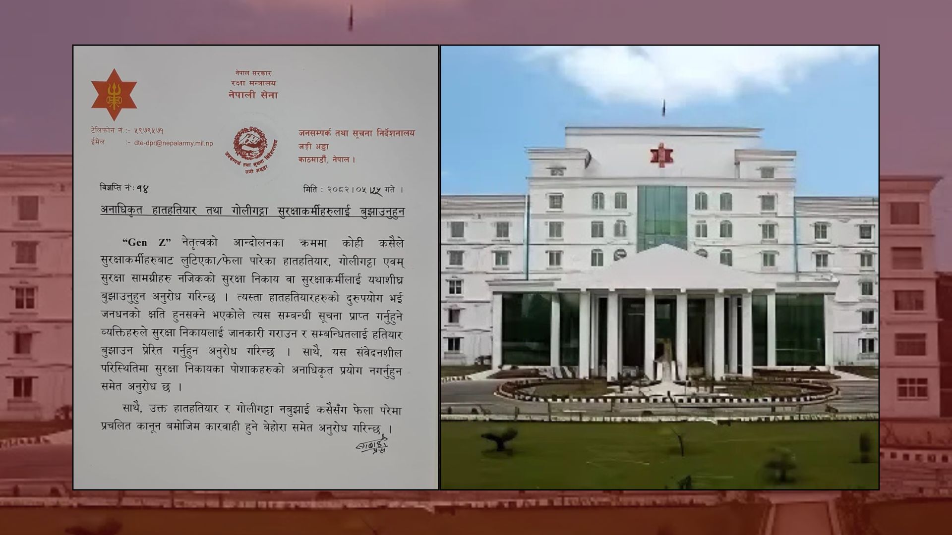 काठमाडौं । जेनजी नेतृत्वको आन्दोलनका सुरक्षाकर्मीहरुबाट लुटिएका वा फेला पारेका हातहतियार, गोलीगट्ठा एवम् सुरक्षा सामग्रीहरु सुरक्षा निकाय वा सुरक्षाकर्मीलाई यथाशीघ्र...