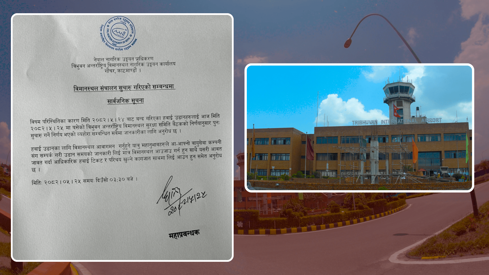 काठमाडौं । त्रिभुवन अन्तर्राष्ट्रिय विमानस्थल सञ्चालनमा आएको छ । मंगलबार मध्याह्नदेखि बन्द भएको विमानस्थल बुधबार अपराह्नदेखि सञ्चालनमा आएको हो ।...
