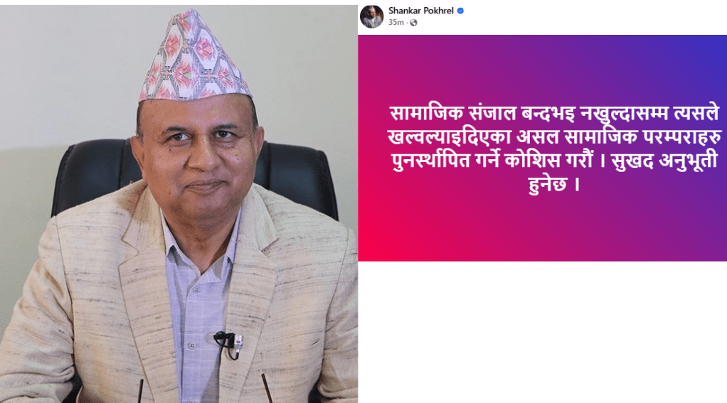 काठमाडौँ । नेकपा एमालेका महासचिव शंकर पोखरेलले सामाजिक संजाल बन्द भइ नखुल्दासम्म त्यसले खलबल्याएका असल सामाजिक परम्पराहरू पुनस्र्थापित गर्ने कोशिसमा...