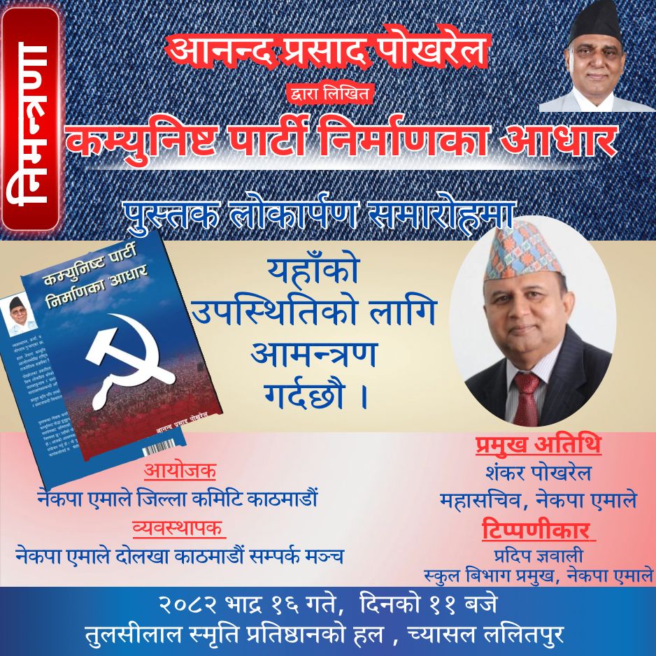 बागमती मुख्य समाचार राजनीति समाचार पूर्वमन्त्री पोखरेलको ‘कम्युनिष्ट पार्टी निर्माण’ आज सार्वजनिक गरिँदै काठमाडौं । नेकपा एमालेका पोलिटब्युरो सदस्य एवम् पूर्वमन्त्री आनन्द प्रसाद पोखरेलको ‘कम्युनिष्ट पार्टी निर्माणका आधार’ नामक पुस्तक आज लोकार्पण गरिने... BY रातो कागज १ महिना अघि 0 Comment