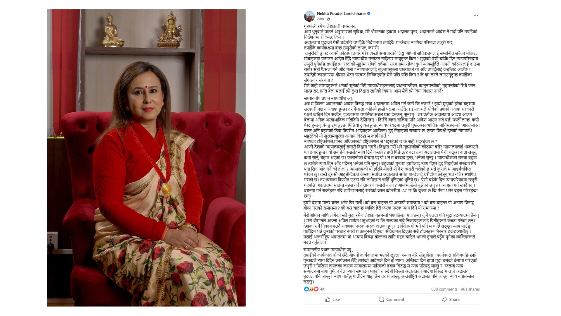 काठमाडौं । राष्ट्रिय स्वतन्त्र पार्टीका सभापति रवि लामिछानेको मुद्दालाई लिएर उनकी पत्नी निकिता पौडेलले गृहमन्त्री रमेश लेखकमाथि न्यायिक प्रक्रियामा प्रत्यक्ष...