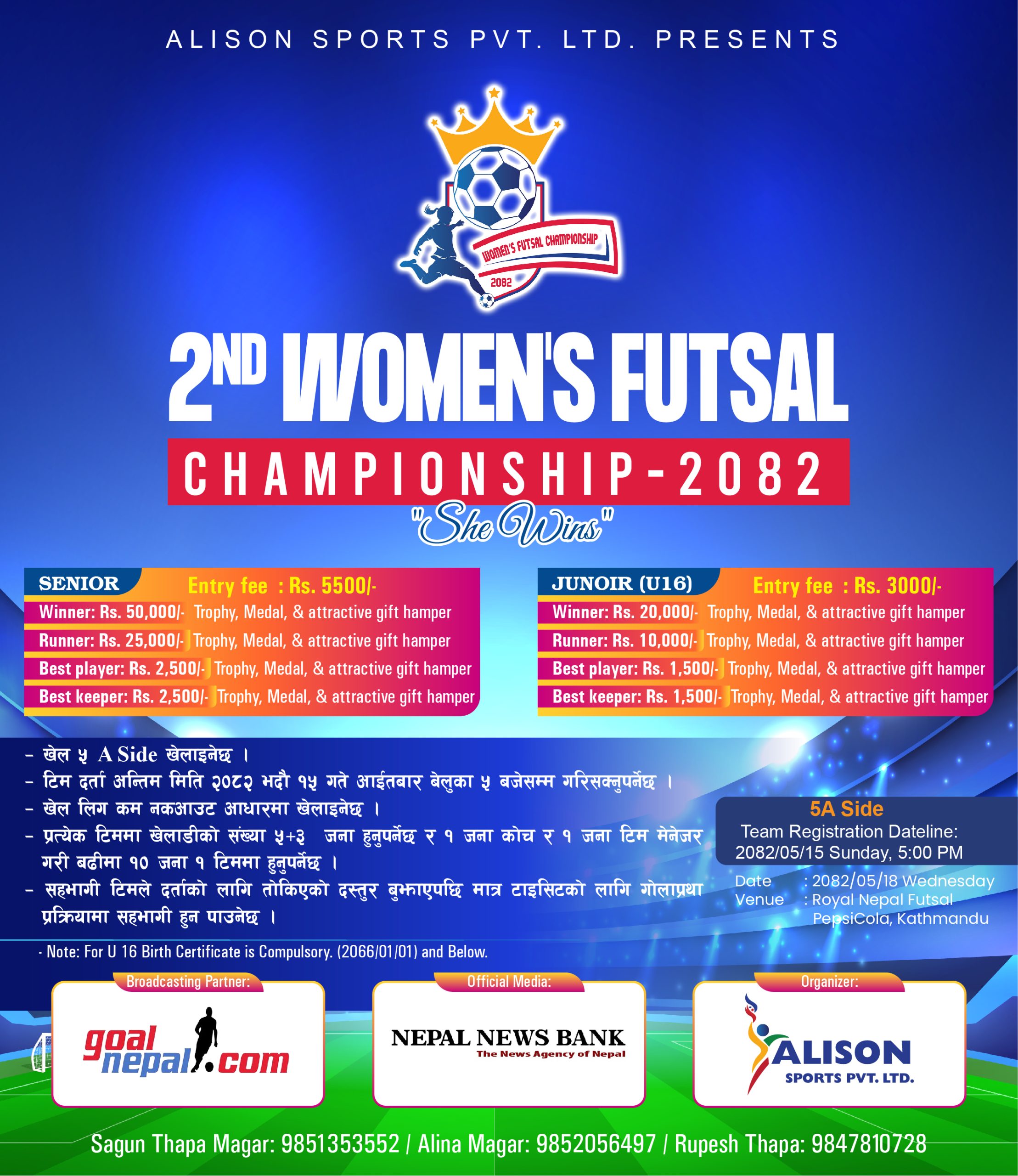 एलिसन स्पोट्र्सले काठमाडौंमा ‘दोस्रो महिला फुटसल च्याम्पियनसीप’ गर्ने