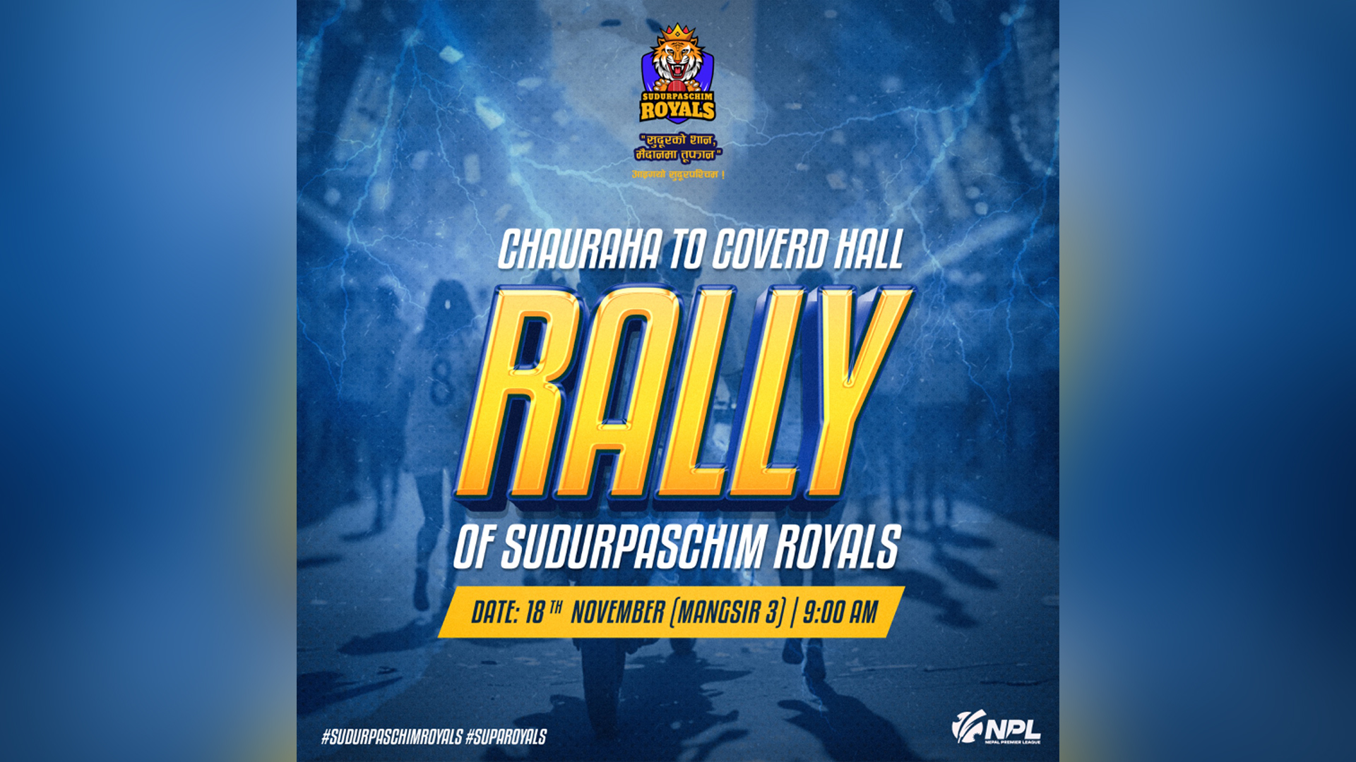 प्रवास मुख्य समाचार समाचार समाज सुदूरपश्चिम सुदूरपश्चिम रोयल्सले धनगढीमा सोमबार भव्य र्याली गर्ने २ मङ्सिर, काठमाडौं । नेपाल प्रिमियर लिग (एनपिएल) टोली सुदूरपश्चिम रोयल्सले धनगढीमा सोमबार भव्य र्याली गर्ने भएको छ । सुदूरपश्चिम रोयल्सले... BY रासस 0 Comment