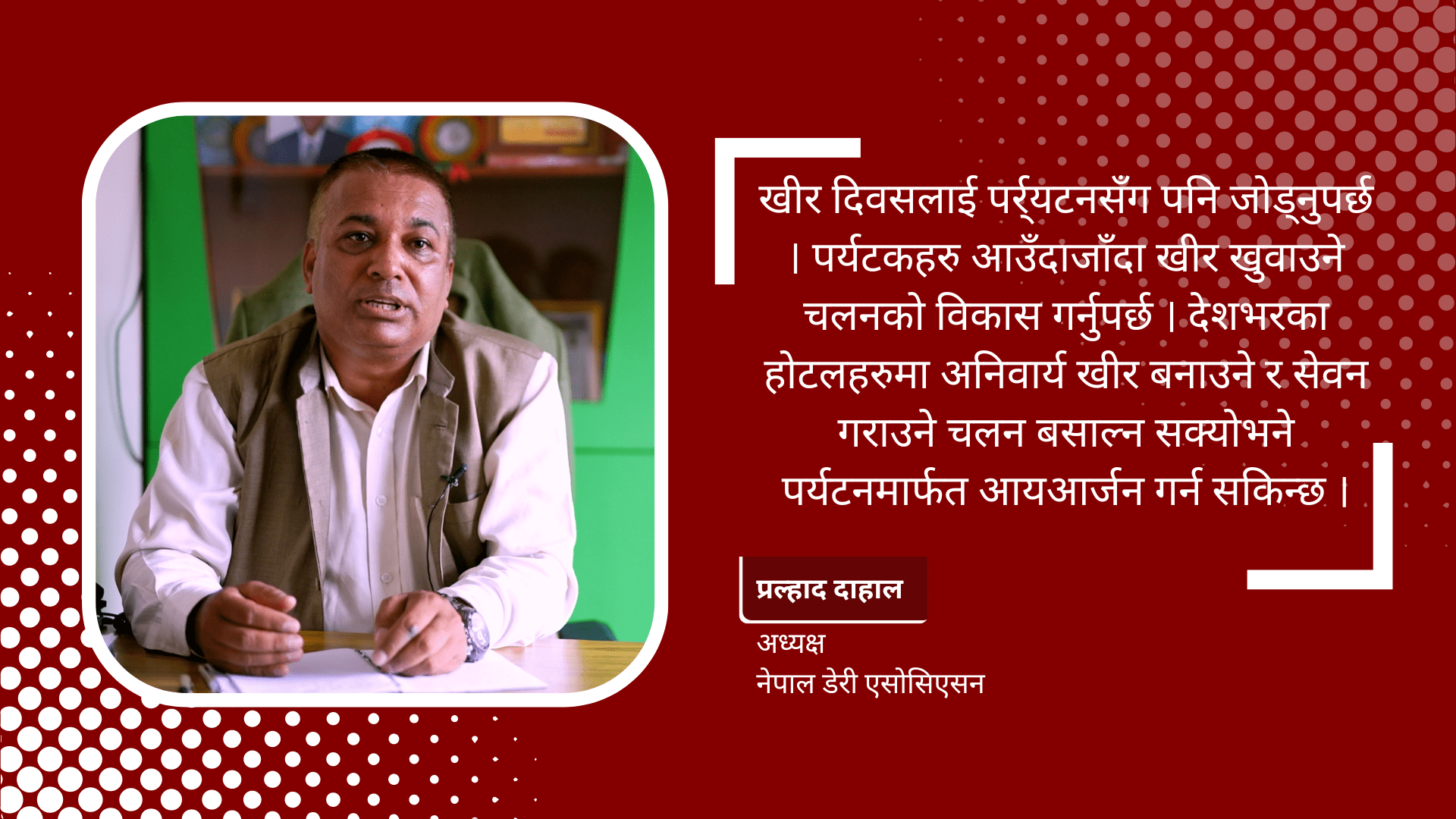 जीवनशैली पर्यटन मुख्य समाचार समाचार समाज ‘सामाजिक संजालले खीर दिवसको महत्व थप बढाएको छ’ ‘खीर दिवसलाई... साउन १५ को बषयमा नेपाल डेरी एसोसिएसनका अध्यक्ष प्रल्हाद दाहालसँग गरिएको कुराकानीमा आधारित । खीर दिवसलाई पर्यटनसँग पनि जोड्नुपर्छ ।... BY रातो कागज 0 Comment